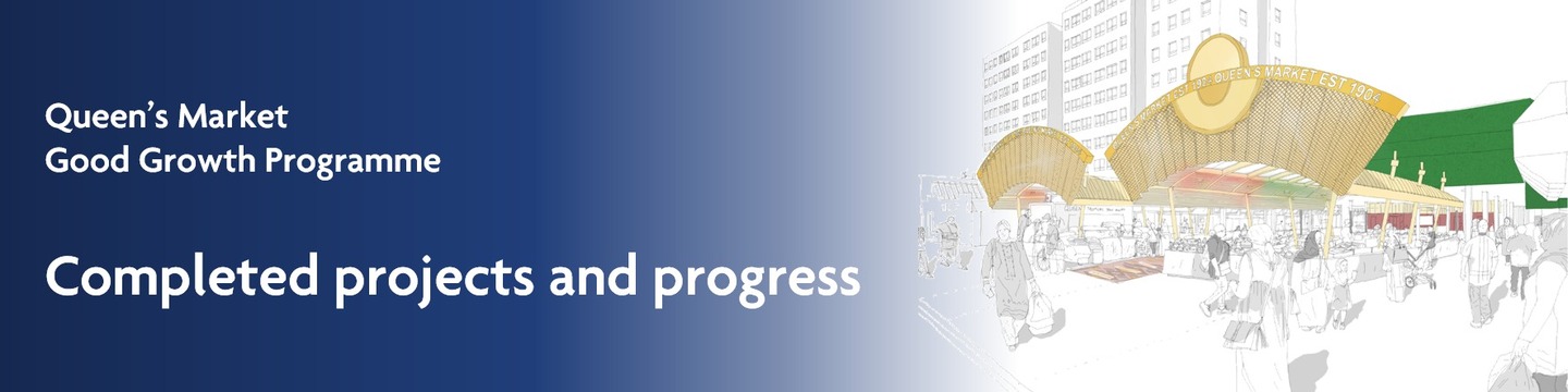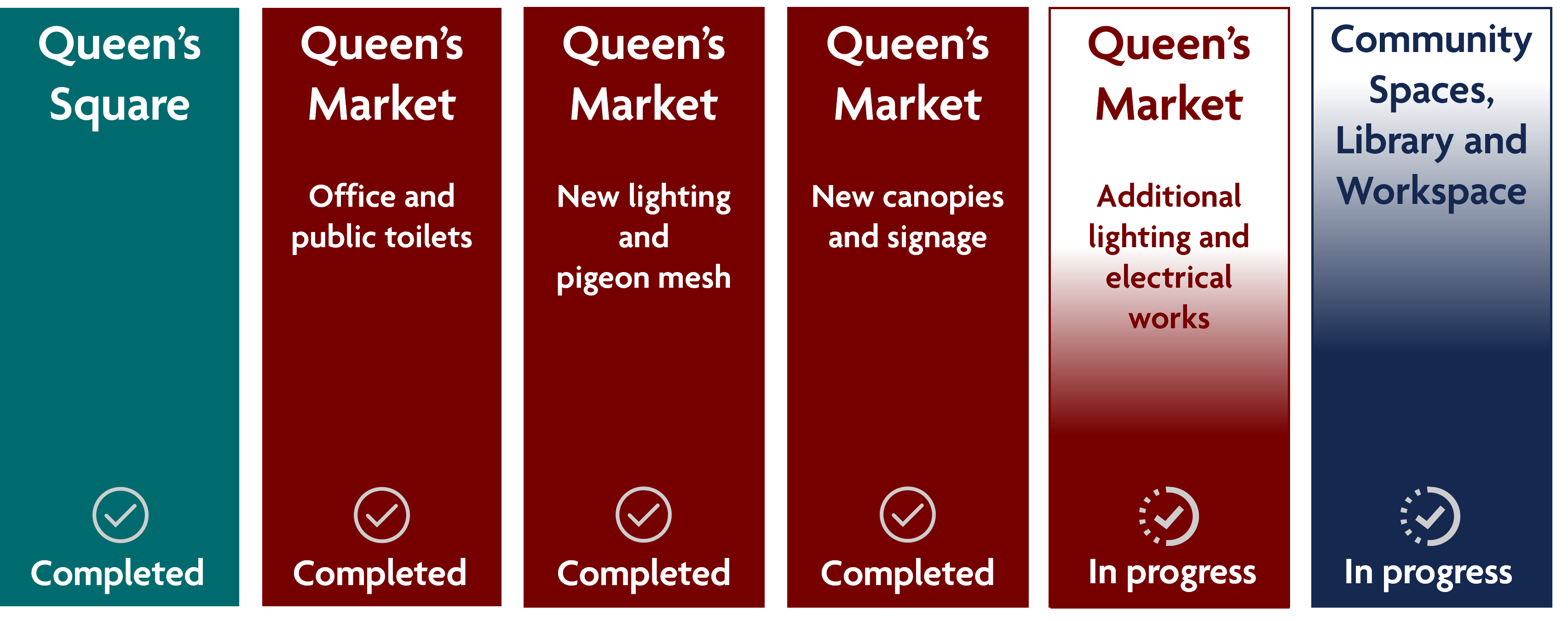 In summer 2025, we have completed delivery of new canopies and signage at the entrance of Queen's Square. These new beautifu structures provide more space for traders and the signage is now visible from the street. An additional signage has also been installed at the entrance from Rochester Avenue.