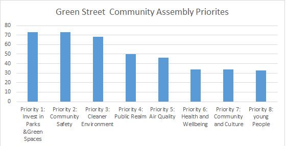 The top 3 chosen priorities for the 2021/22 Green Street Community Assembly cycle are: