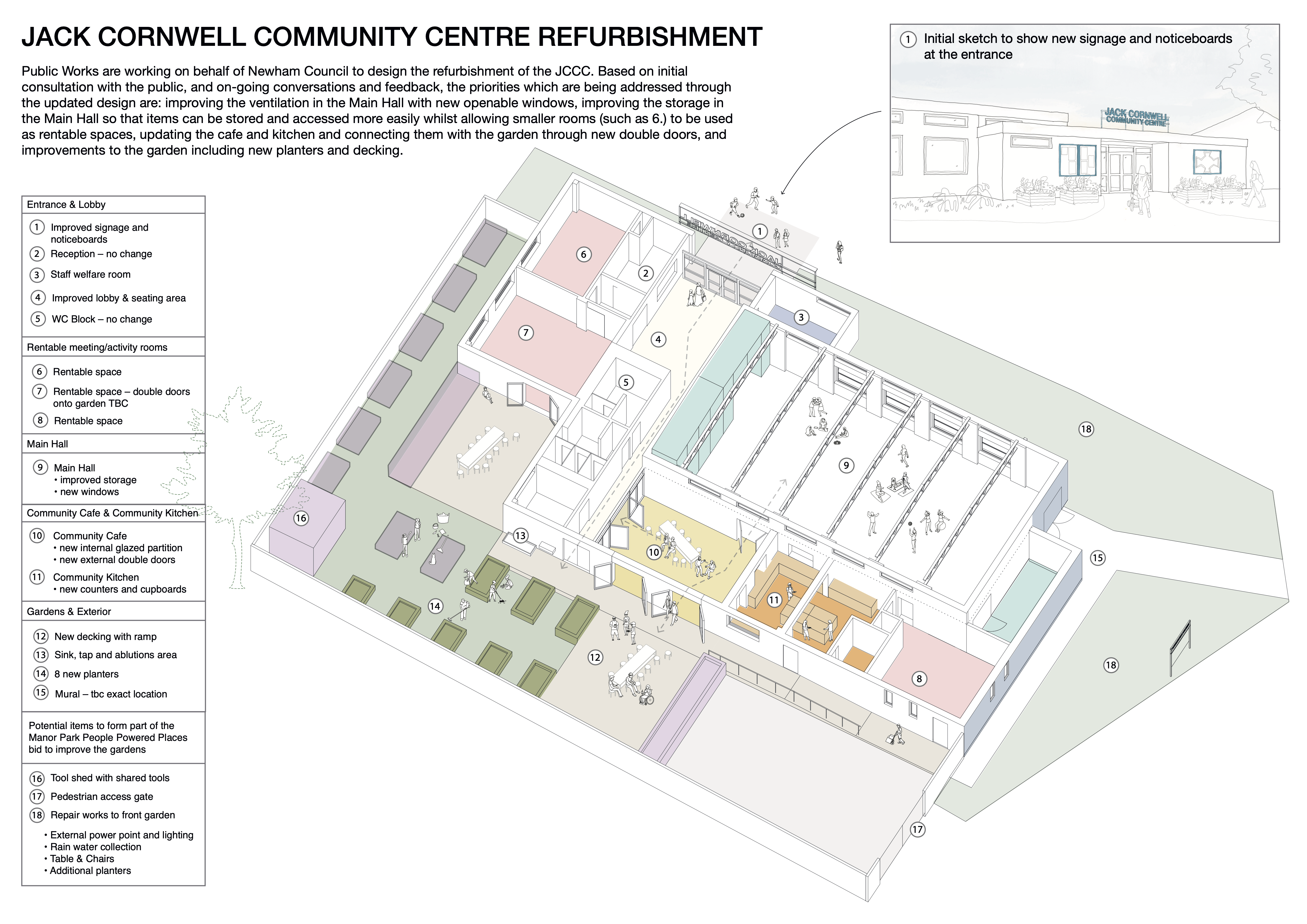 They have been working on design proposals that incorporate the comments from users of the centre and other local residents. They have run three engagement events, one in June,one in July, and one is September to share the current designs and gather people's opinions. Please see the drawing below which outlines the design changes that will take place.