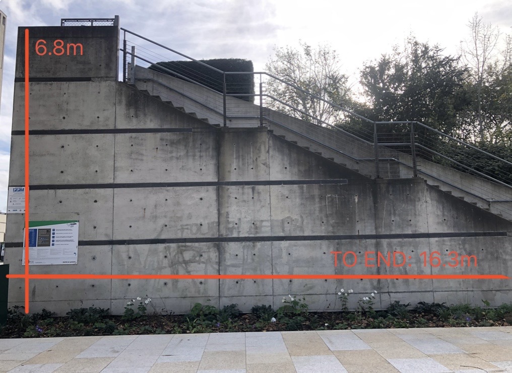 - Staircase wall: LENGTH 16.3m x HEIGHT 6.8m at longest points, then cascades down